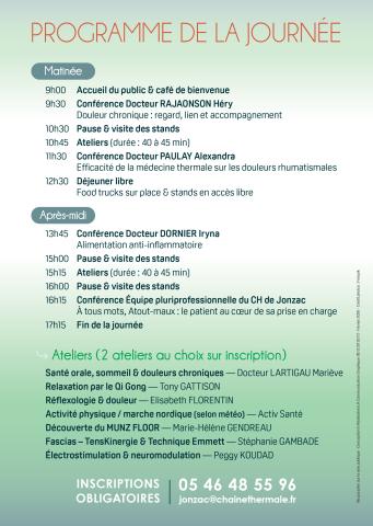 Ne manquez pas l'événement exceptionnel de la 1ère édition ! Organisée par les Thermes et l'hôpital de Jonzac, cette journée unique est dédiée à la gestion des douleurs chroniques. Profitez de conférences et d'ateliers animés par des médecins spécialistes et des experts en santé du territoire de la Haute-Saintonge pour découvrir des solutions concrètes pour apaiser vos douleurs.